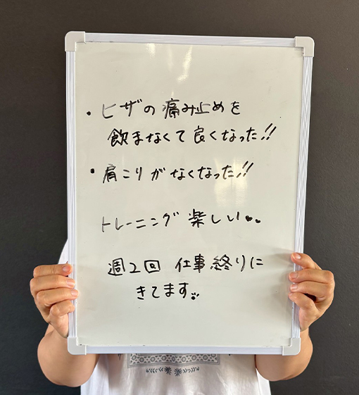 カッコいいパパになるために通い始めました。筋トレは「トレーニングをする姿勢がすごい大事」なんだと感じました。筋肉痛以外、どこも痛めることなく続けられています。トレーナーさんも綺麗な方で、すごく話しやすく楽しく通わせてもらっています。通い始めて半年ですが、7kgの減量に成功しています。これも無理なく続けられている成果だと思います。
