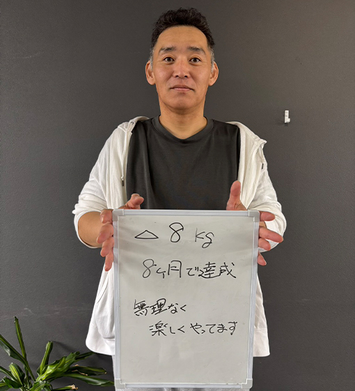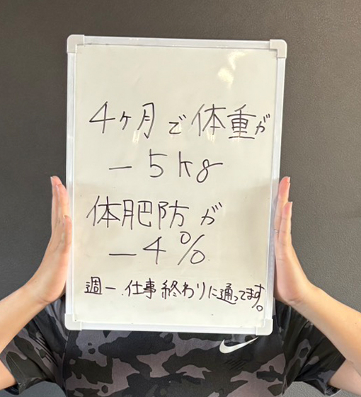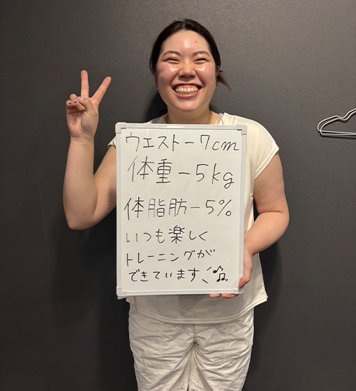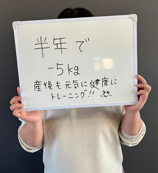 カッコいいパパになるために通い始めました。筋トレは「トレーニングをする姿勢がすごい大事」なんだと感じました。筋肉痛以外、どこも痛めることなく続けられています。トレーナーさんも綺麗な方で、すごく話しやすく楽しく通わせてもらっています。通い始めて半年ですが、7kgの減量に成功しています。これも無理なく続けられている成果だと思います。